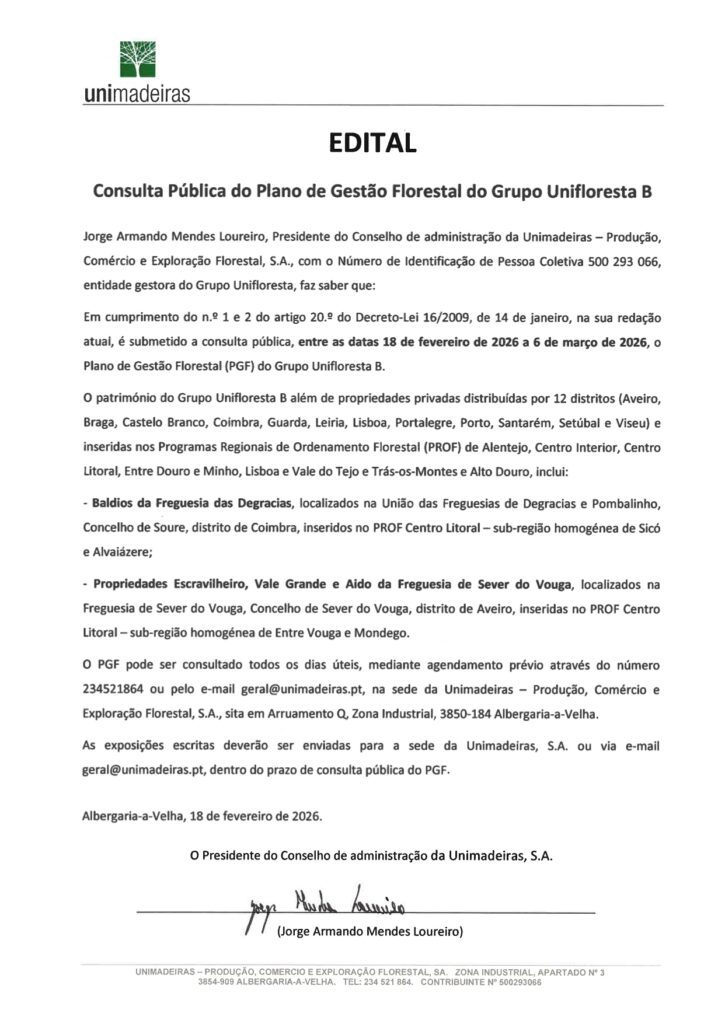 Em cumprimento do n.º 1 e 2 do artigo 20.º do Decreto-Lei 16/2009, de 14 de janeiro, na sua redação atual, é submetido a consulta pública, entre as datas 18 de fevereiro de 2026 a 6 de março de 2026, o Plano de Gestão Florestal (PGF) do Grupo Unifloresta B.